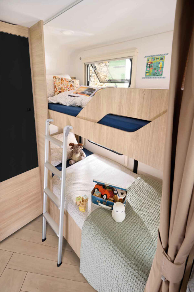 Imagine yourself in front of this caravan, open the door and discover the optimized space, the optimum sleeping comfort with a fixed bed for the parents, bunk beds and the dinette area convertible into a 2-person bed for the children, the independent and spacious bathroom. You will enjoy numerous storage spaces and the bike garage to store all your belongings.