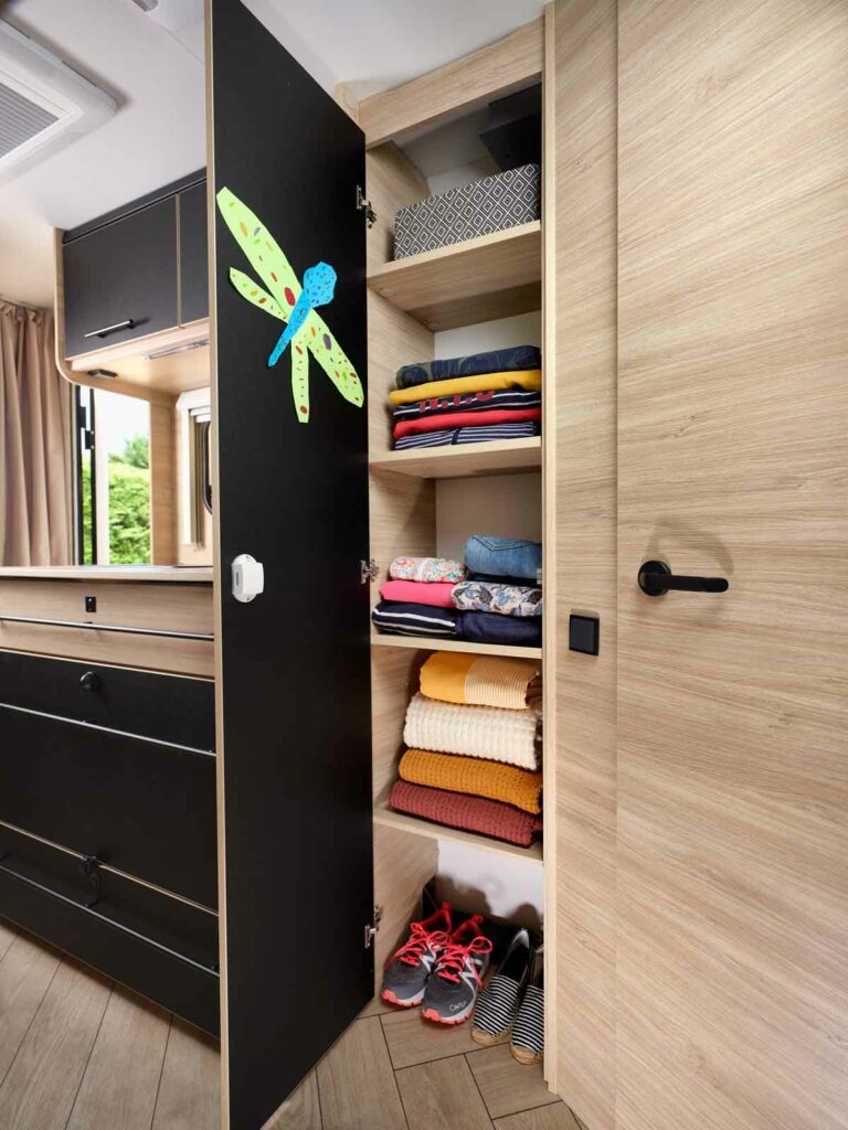 With its two bunk beds at the rear, a large fixed bed at the front, and a convertible dinette, the 496PE offers great accommodation capacity without sacrificing comfort. No face-to-face sleeping arrangements, smooth circulation, a well-equipped bathroom, a 15 cm mattress, and an XL fridge: everything is in place for family travel in a bright, practical, and well-structured environment.