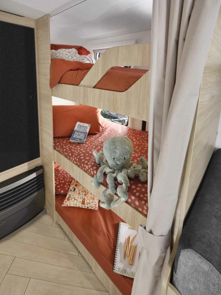 With its three bunk beds at the rear, a double bed at the front, and a spacious convertible lounge, the 497PE offers an ideal configuration for large families. Each space is well separated, with no face-to-face beds, for more privacy and fluidity on board. Functional, well-equipped, and designed to last.